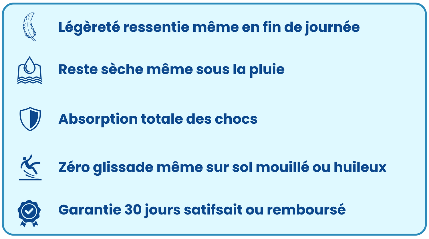 Nos baskets ont été testées lors de shifts de 12 heures consécutives. Si vous ressentez la moindre gêne, nous vous remboursons intégralement sous 30 jours.